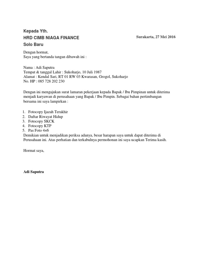 Contoh Surat Lamaran Kerja Bank Cimb Niaga