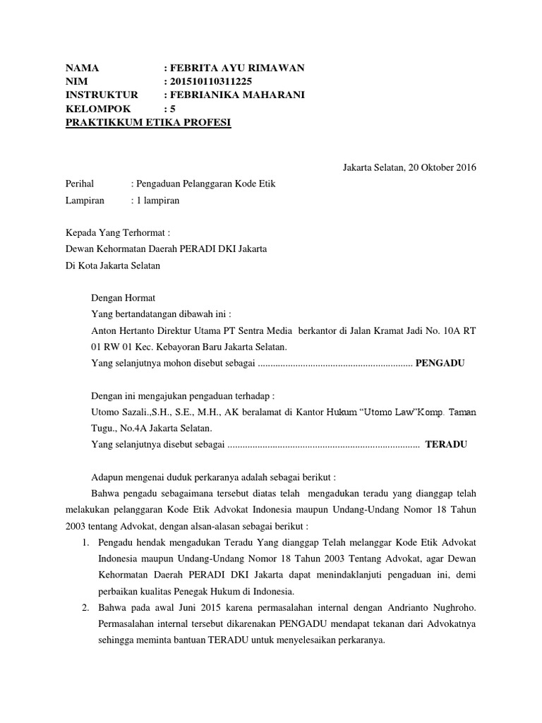 Apakah anda sedang mencari informasi Contoh Surat Pengaduan Pelanggaran Kode Etik Advokat.
