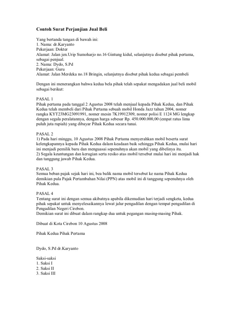 Contoh Surat Perjanjian Jual Beli Mobil Contoh Surat