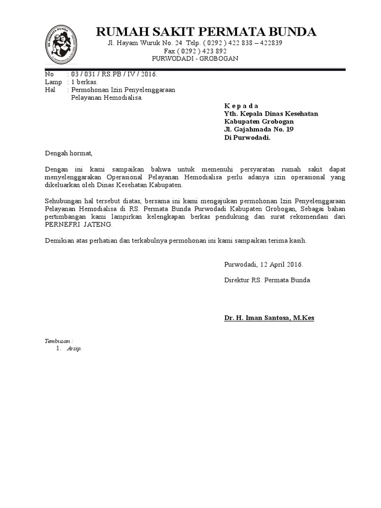 Rumah Sakit Permata Bunda Kepada Yth Kepala Dinas Kesehatan