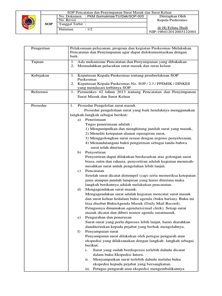 23 Sop Pencatatan Dan Penyimpanan Suart Masuk Dan Surat Keluar
