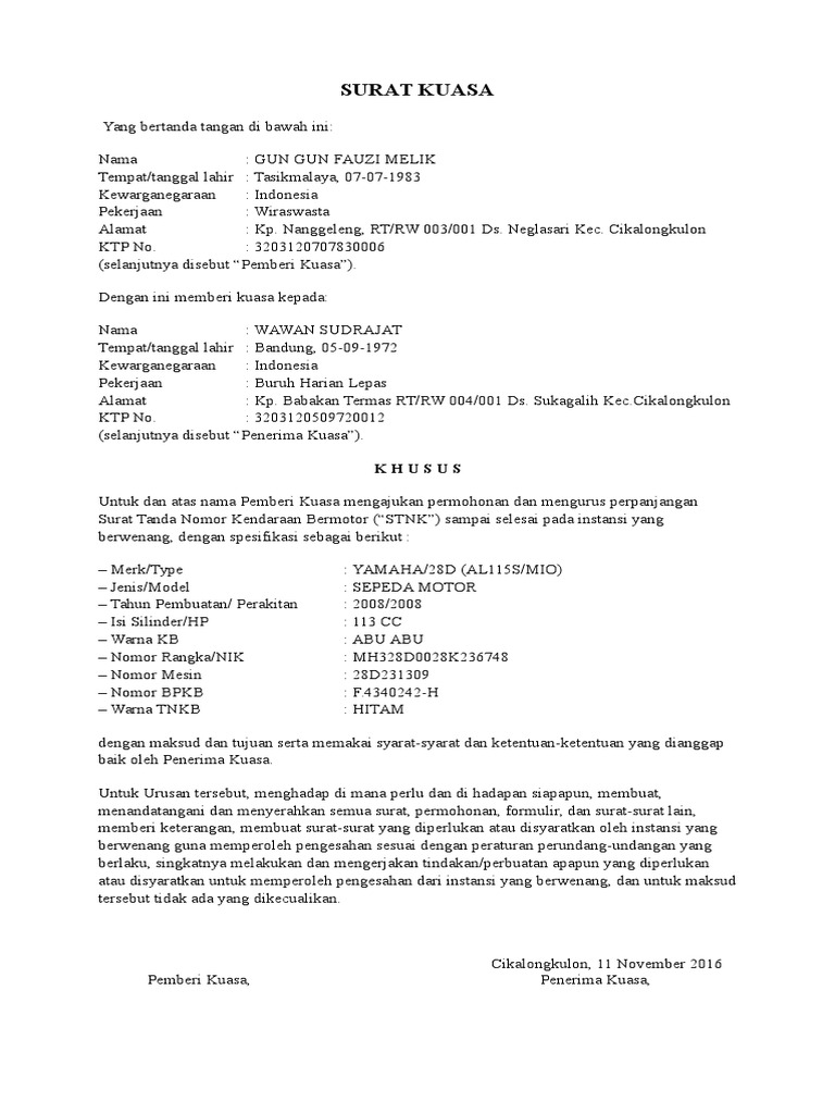 Contoh Surat Kuasa Untuk Perpanjang Stnk