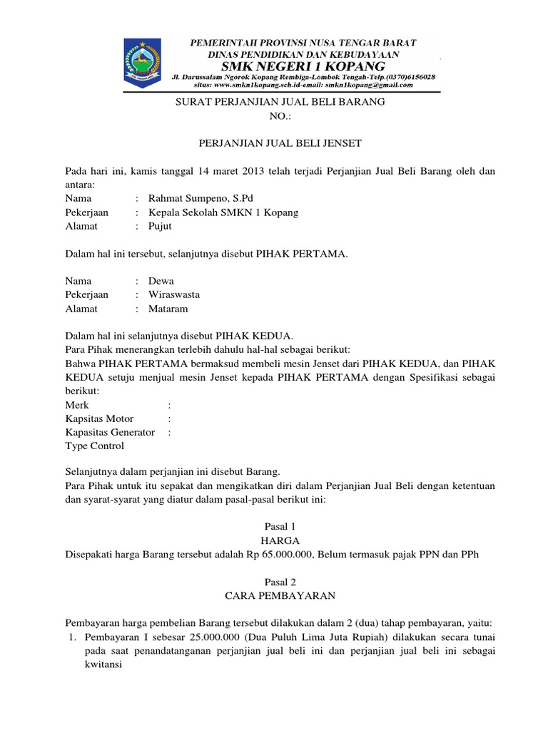 Surat Perjanjian Jual Beli Barang Beserta Pasalnya Suratmenyuratnet