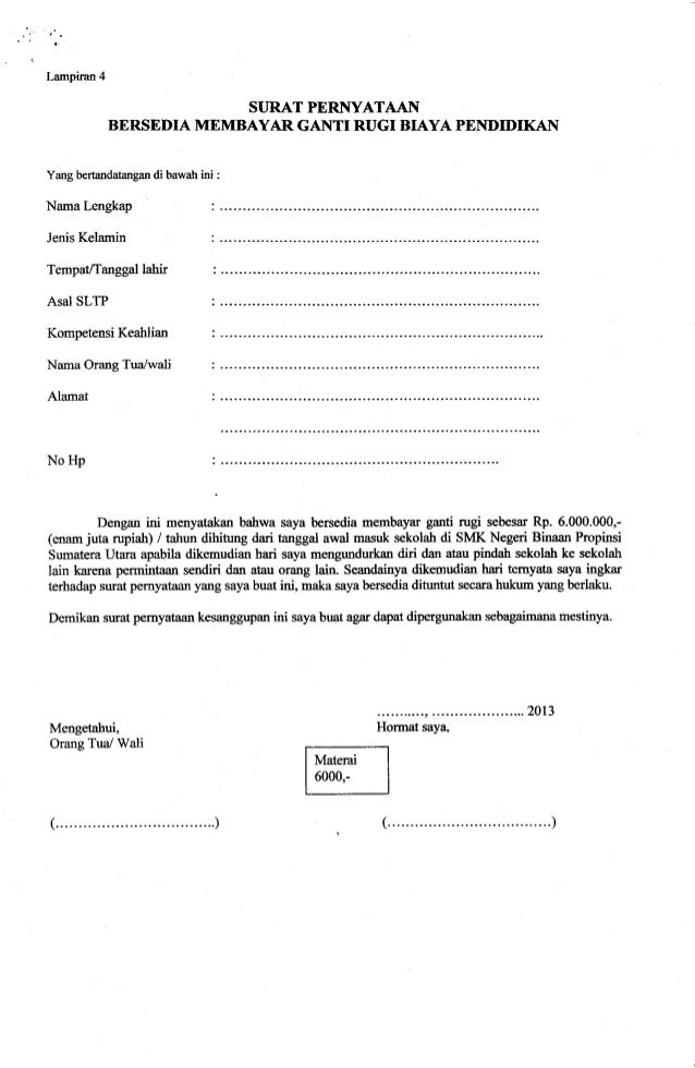 Contoh Surat Pernyataan Murid Orang Tua Ganti Rugi Bebas Narkoba