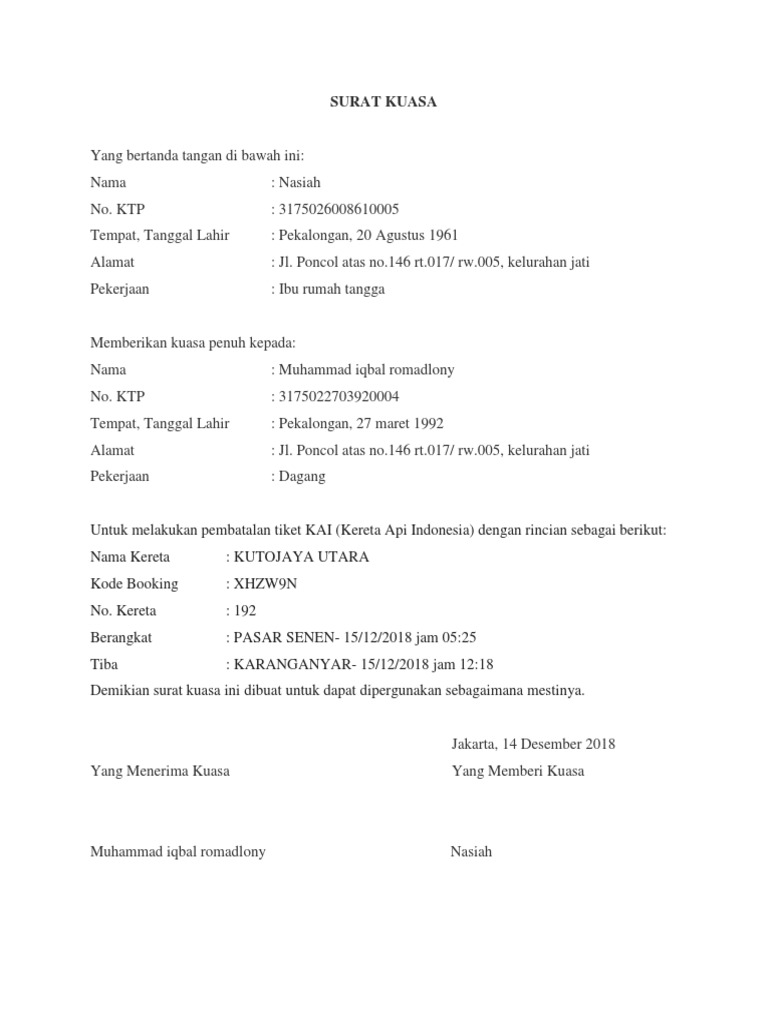 Contoh Surat Kuasa Pembatalan Tiket Kereta Api Indonesia Surat Kuasa