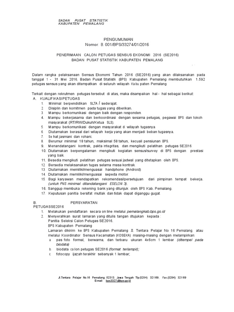 Perekrutan Petugas Sensus Ekonomi 2016 Bps Kota Malang