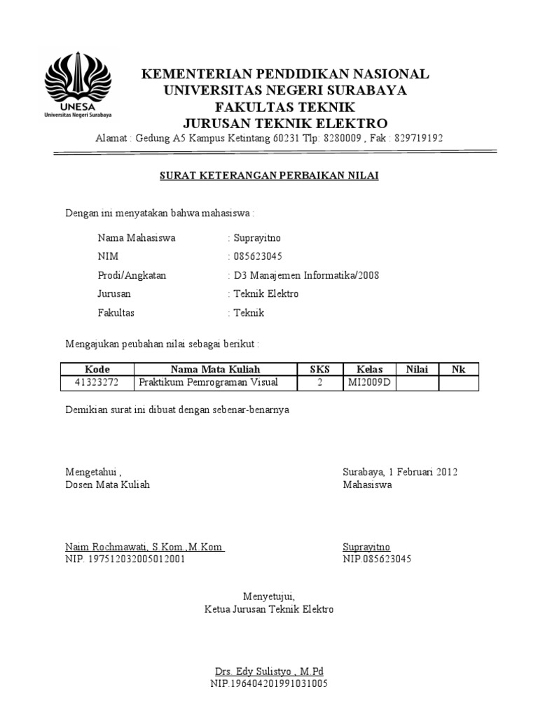 Surat Permohonan Pengajuan Perbaikan Nilai