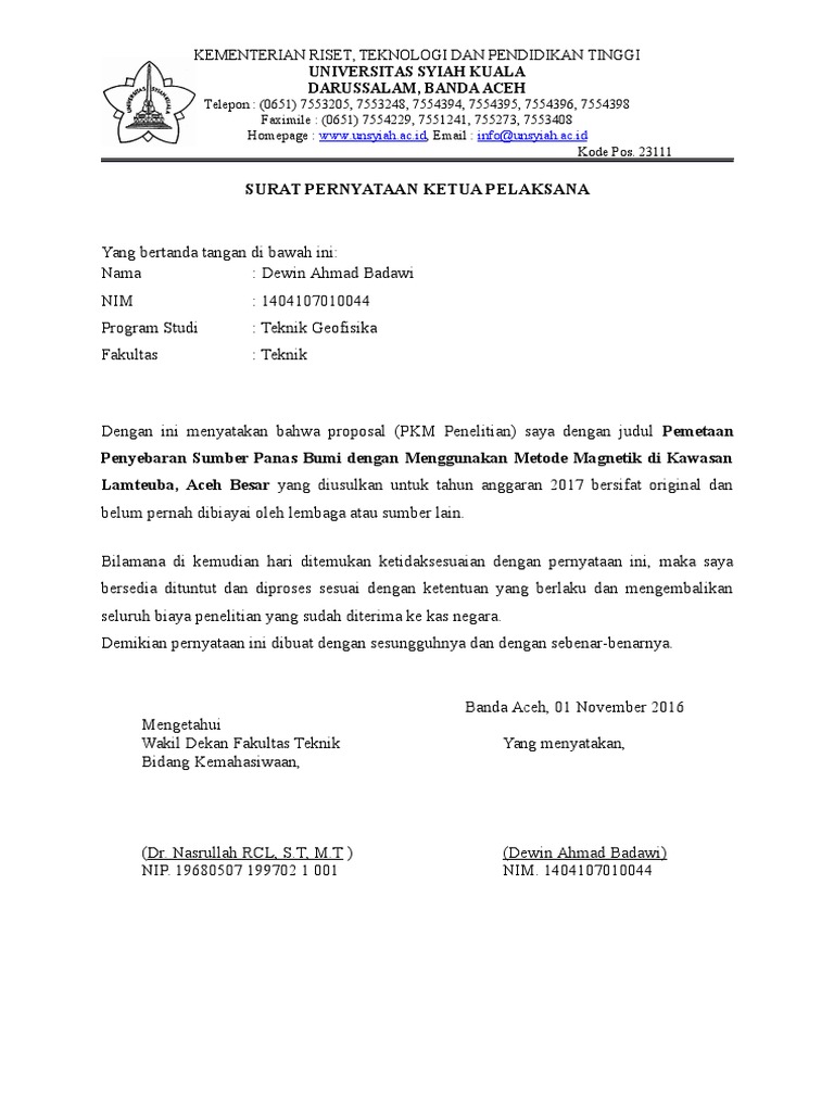 Contoh Surat Pernyataan Ketua Pkm Putudocx