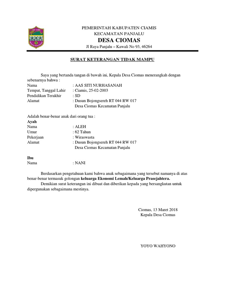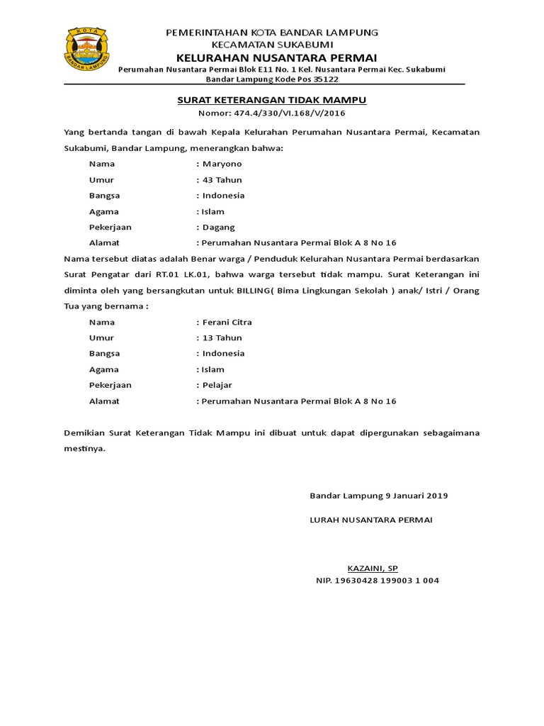 Contoh Surat Keterangan Tidak Mampu Untuk Kjp Suratmenyuratnet