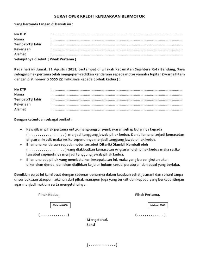 Jika ada sedang mencari Contoh Surat Perjanjian Over Kredit Motor.