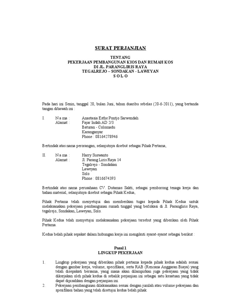 Contoh Surat Perjanjian Tentang Pekerjaan Pembangunan Kios Dan Rumah Kos