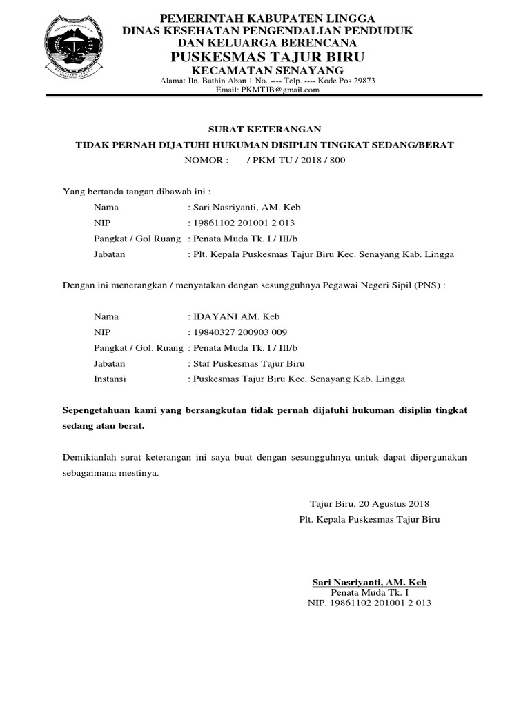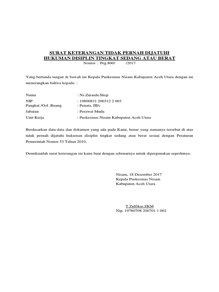 contoh surat keterangan tidak pernah dijatuhi hukuman disiplin,