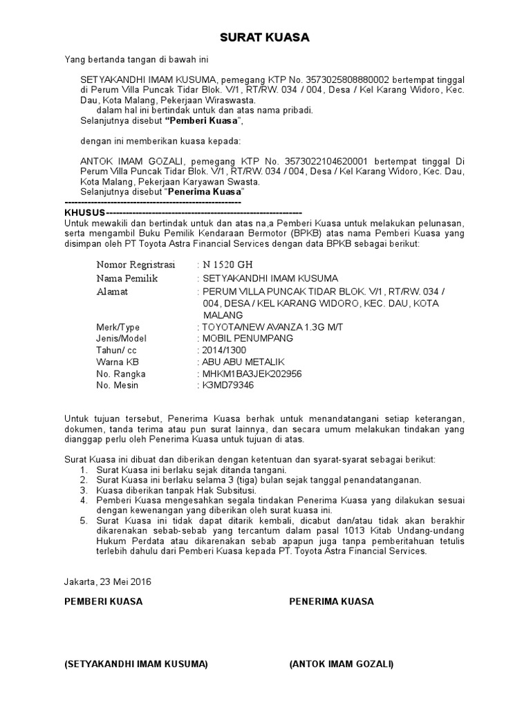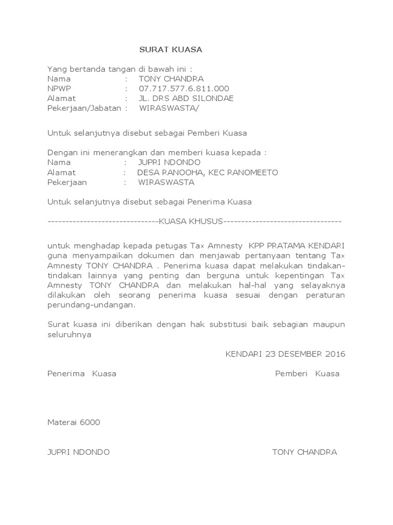 Contoh Surat Kuasa Khusus Untuk Tax Amnesty Cover Bb