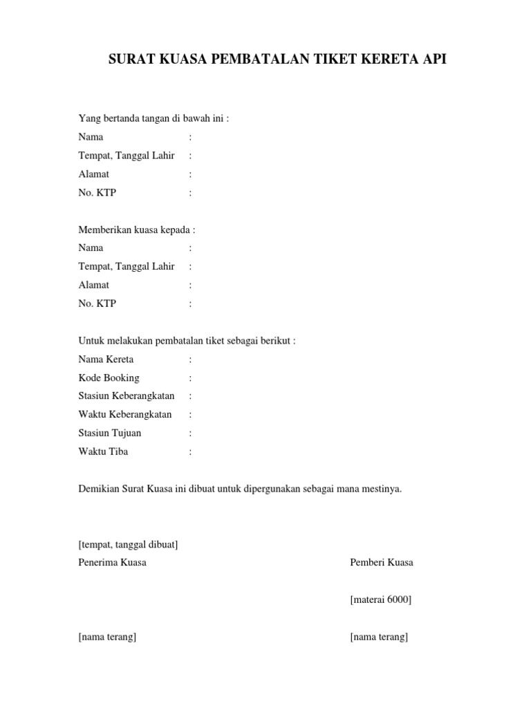Berikut gambar-gambar mengenai Contoh Surat Kuasa Pembatalan Tiket Kereta.