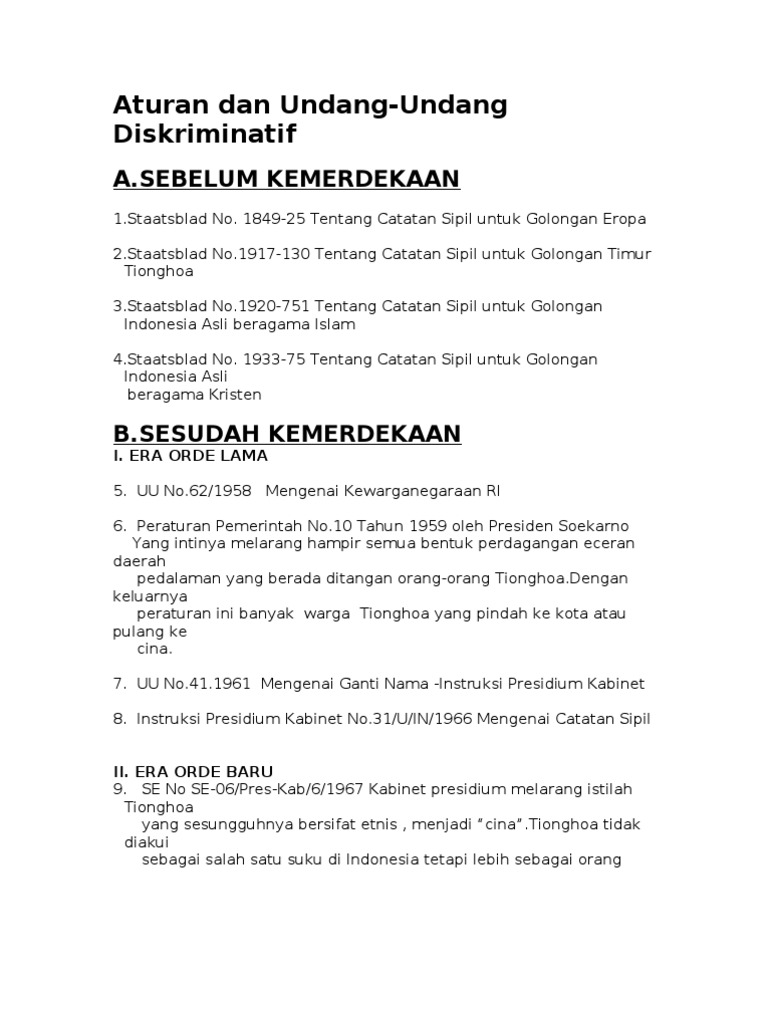 Aturan Dan Undang Undang Diskriminatif Asebelum Kemerdekaan