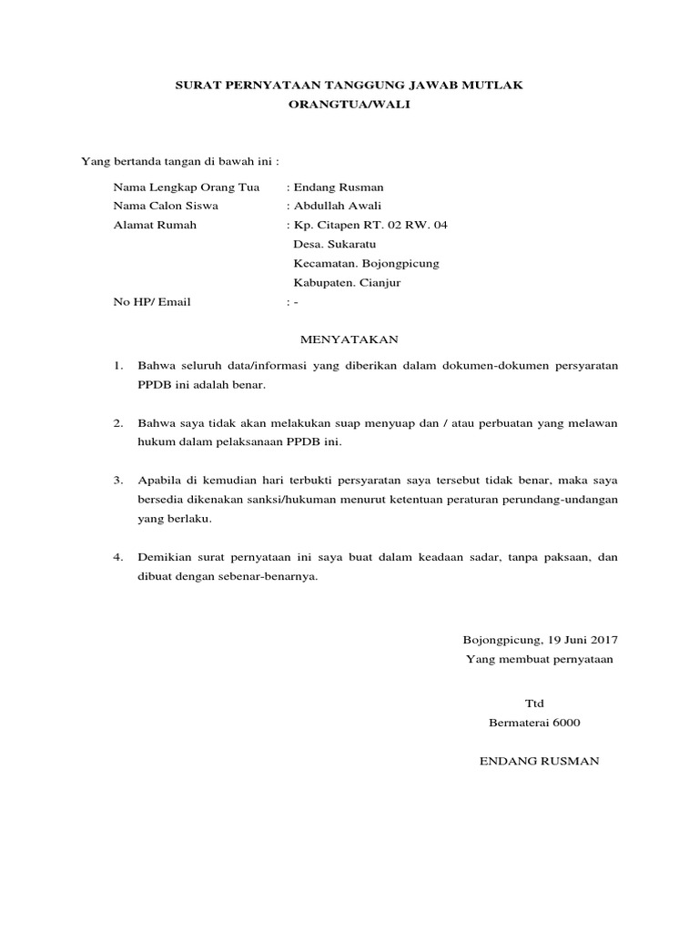 Contoh Surat Tanggung Jawab Orang Tua Atau Wali