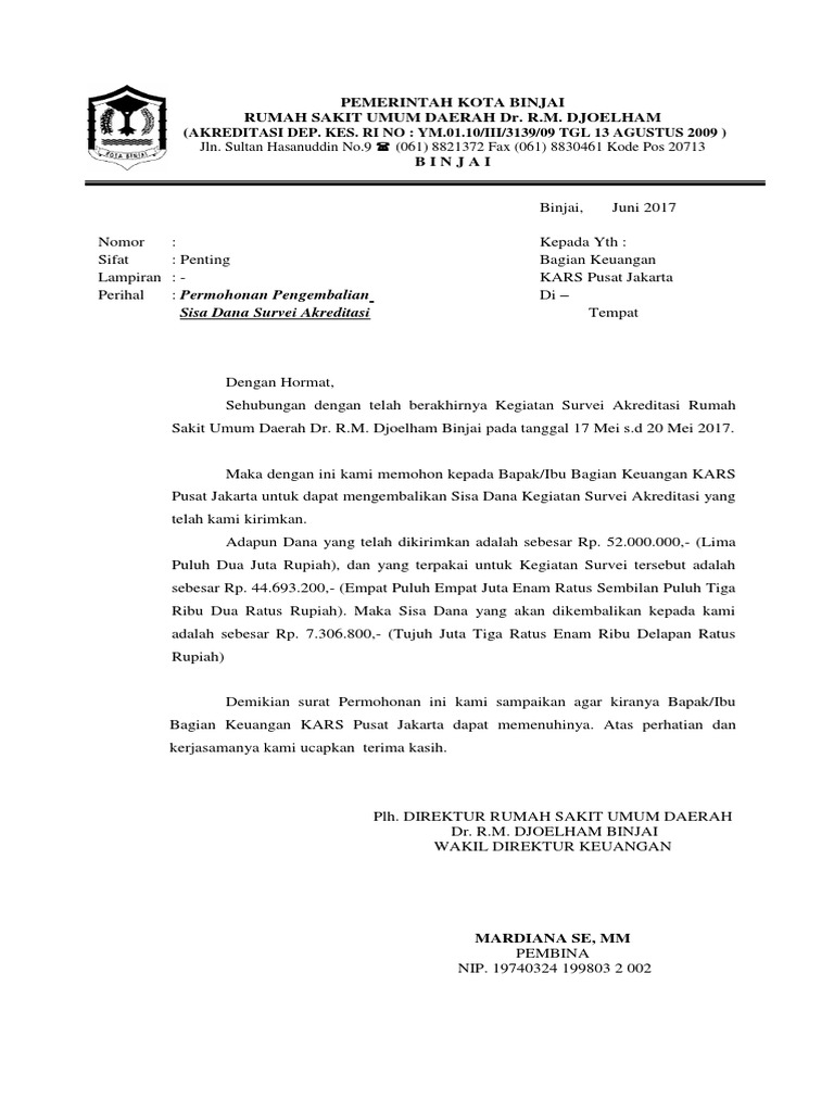 Contoh Surat Permohonan Pengembalian Dana