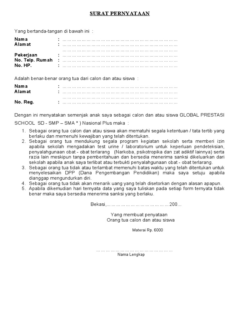 Contoh Surat Pernyataan Orang Tua Untuk Siswa Baru