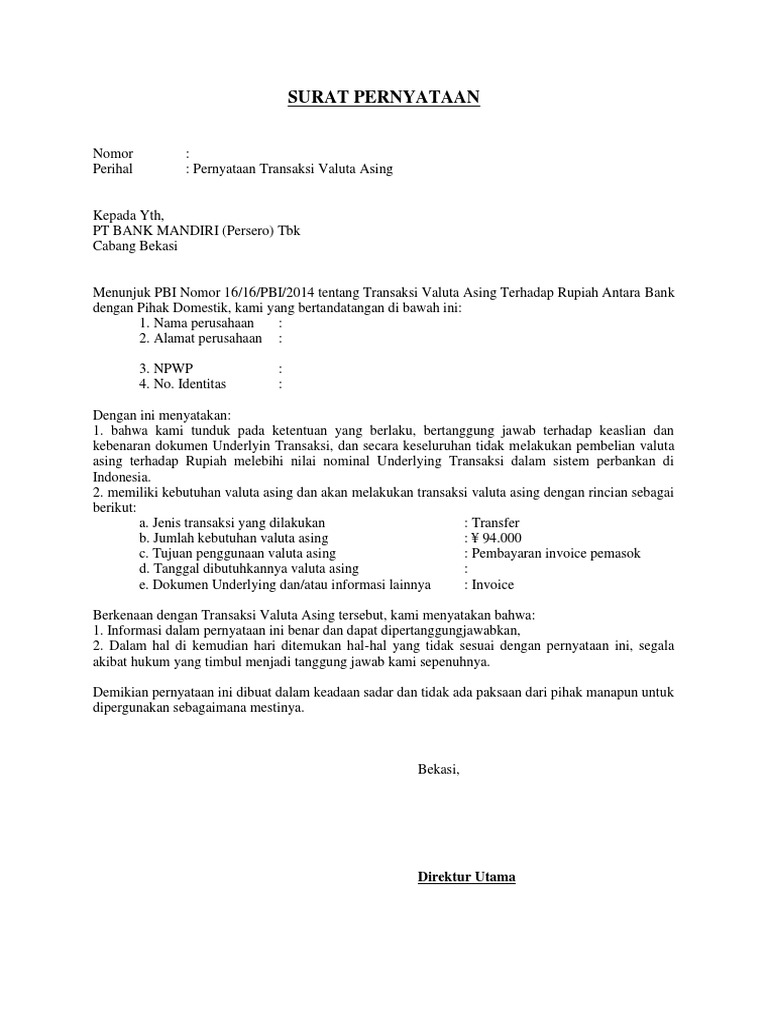 Berikut data lengkap tentang Surat Pernyataan Transaksi Valuta Asing Bank Mandiri.