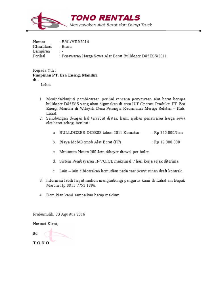 Koleksi admin mengenai Contoh Surat Penawaran Sewa Alat Berat.