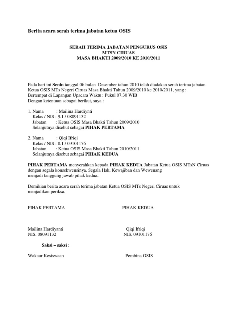 Contoh Surat Serah Terima Jabatan Osis Dan Karang Taruna Gudang