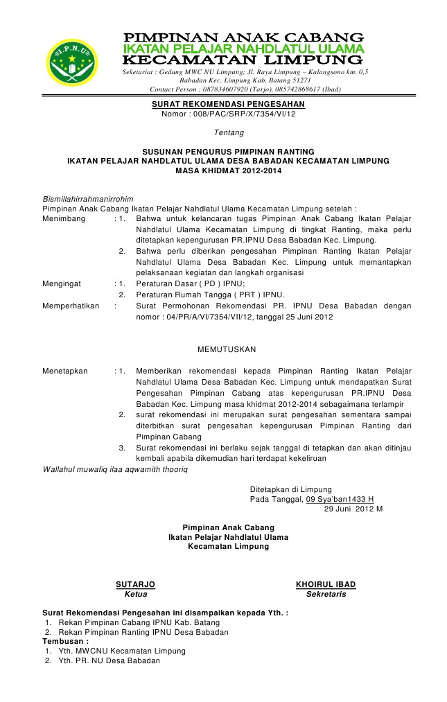 Contoh Surat Rekomendasi Pengesahan Ipnu