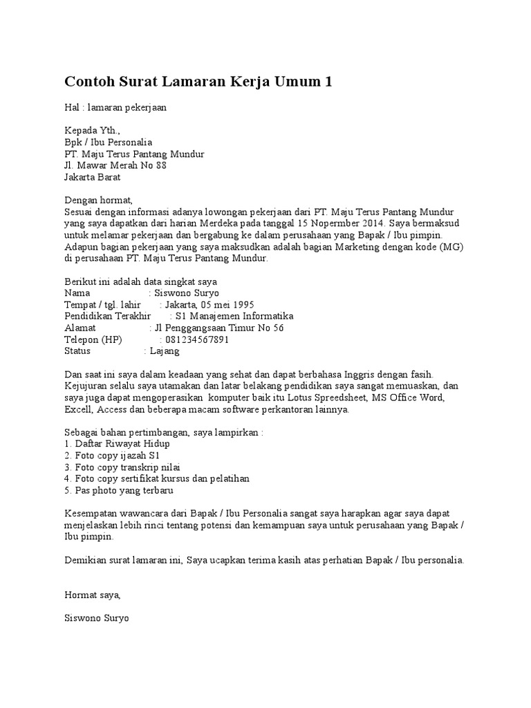 Contoh Surat Lamaran Kerja Umum