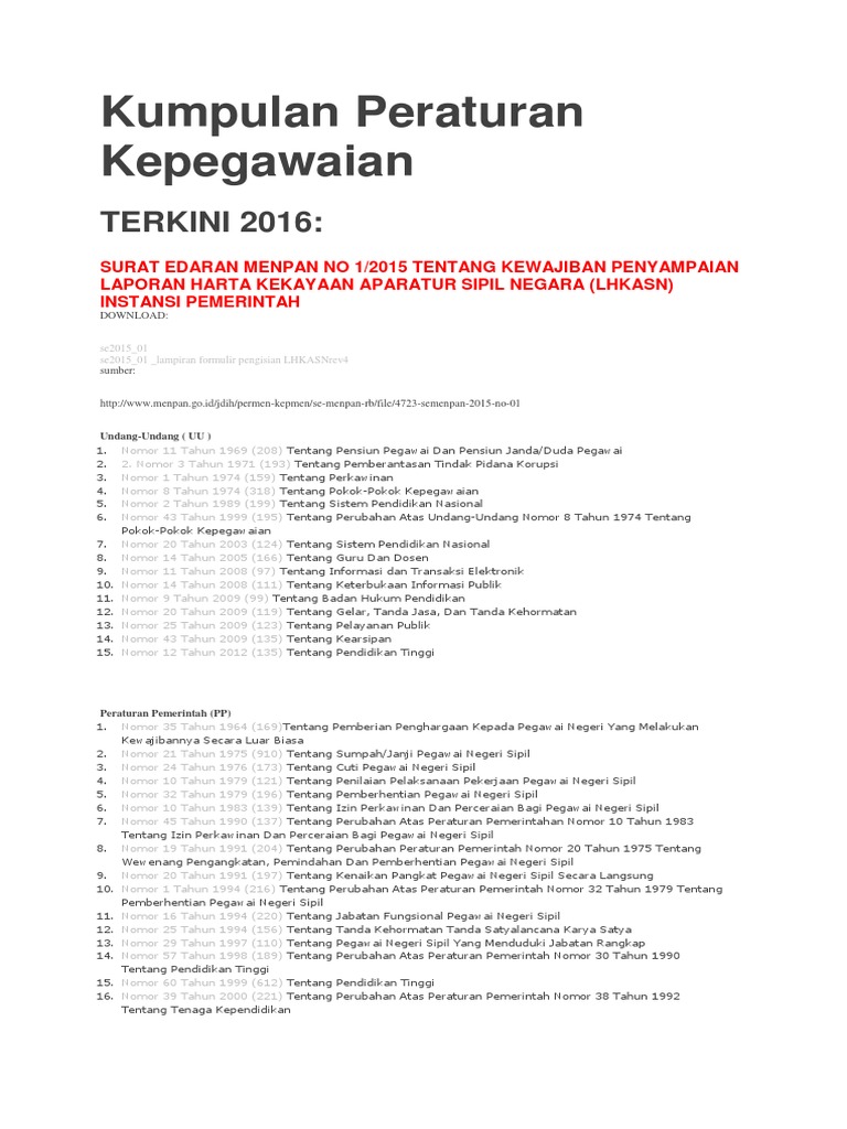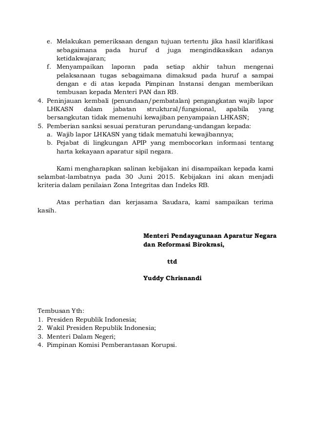 Ketentuan ini sesuai dengan surat edaran menteri pendayagunaan aparatur negara dan reformasi birokrasi pan rb nomor 8 tahun 2015. Surat edaran nomor 05 tahun 2012 tentang kewajiban penyampaian dan sanksi atas ketidakpatuhan terhadap kewajiban laporan harta kekayaan penyelenggara negara di lingkungan kementerianlembaga dan pemerintah daerah. Surat edaran nomor 8 tahun 2015 tentang kewajiban penyampaian surat pemberitahuan tahunan pajak penghasilan wajib pajak orang pribadi oleh aparatur sipil negaraanggota tentara nasional indonesiakepolisian republik indonesia melalui e filing dalam rangka meningkatkan kepatuhan wajib pajak orang pribadi.