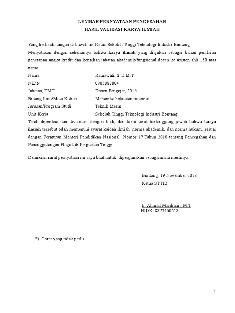 Kumpulan lengkap Surat Pernyataan Pengesahan Hasil Validasi Karya Ilmiah.