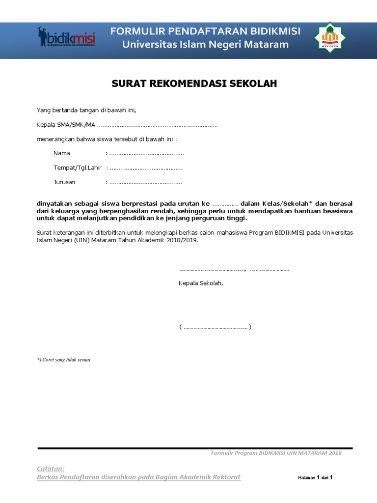 Informasi mengenai Surat Rekomendasi Bidikmisi Dari Kepala Sekolah.