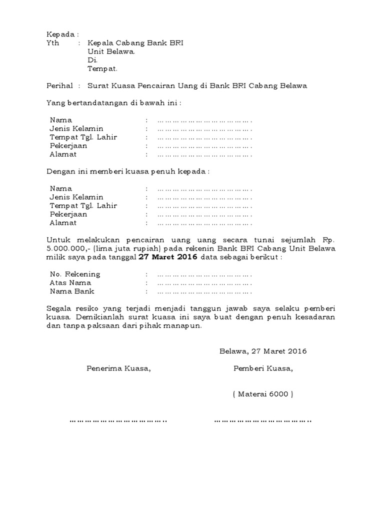 Contoh Surat Kuasa Pengambilan Uang Di Bank