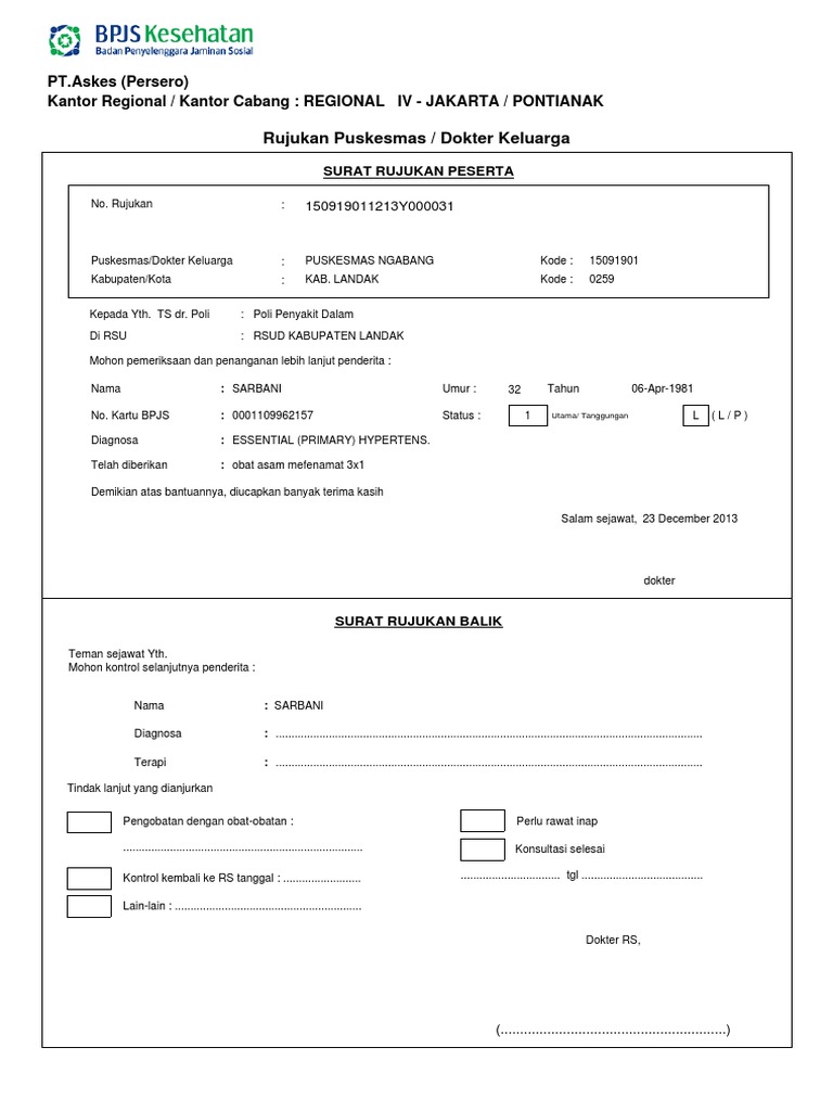 Contoh surat rujukan puskesmas ke rumah sakit. Contoh surat rujukan surat rujukan adalah surat pengantar tenaga medis dalam hal ini ditujukan kepada dokter maupun dokter gigi secara tertulis yang bertujuan sebagai advice petunjuk pengobatan maupun pengobatan secara lebih lanjut kepada tenaga medis yang lebih berkompeten dalam bidangnya. Selain itu surat rujukan juga digunakan dalam sistem berjenjang bpjs kesehatan dimana pasien harus berobat ke fasilitas kesehatan tingkat pertama faskes 1. Contoh surat rujukan puskesmas ke rumah sakit download 5f91d47415 surat rujukan bpjs kesehatan berlaku hanya 30 hari 1 contoh surat rujukan faskes 1 bpjs kesehatan surat rujukan merupakan sebuah surat yang keluarkan dari klinik atau puskesmas.