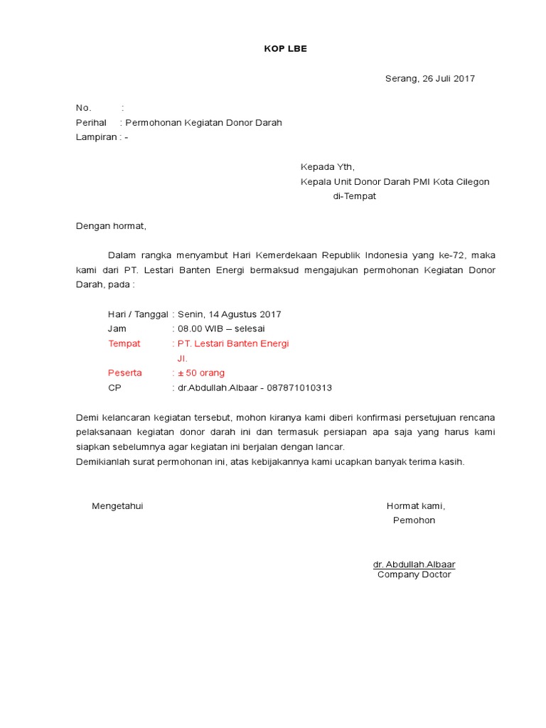Contoh Surat Permohonan Donor Darahdocx Palembang 5 Mei 2017 No