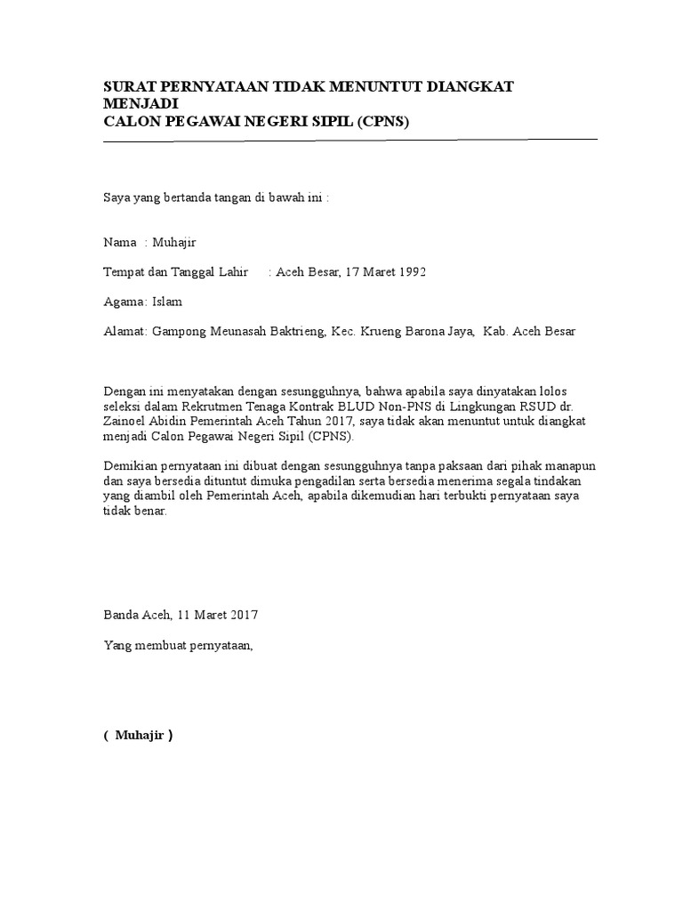Contoh Surat Pernyataan Tidak Menuntut Diangkat Jadi Cpns Contoh