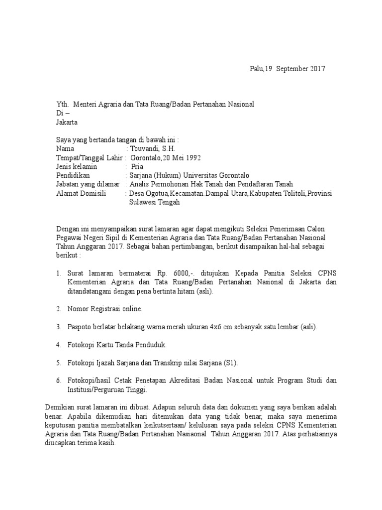 Koleksi admin mengenai Contoh Surat Lamaran Cpns Badan Pertanahan Nasional.