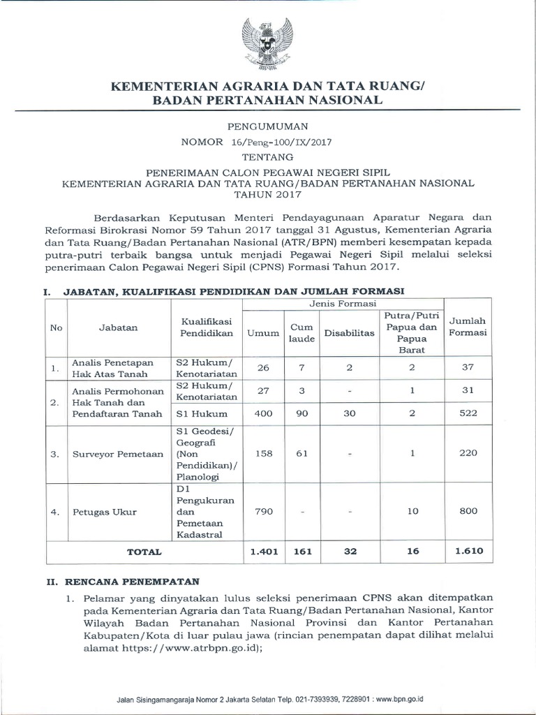 Pengumuman Seleksi Cpns Badan Pertanahan Nasional Bpn Ta 2017