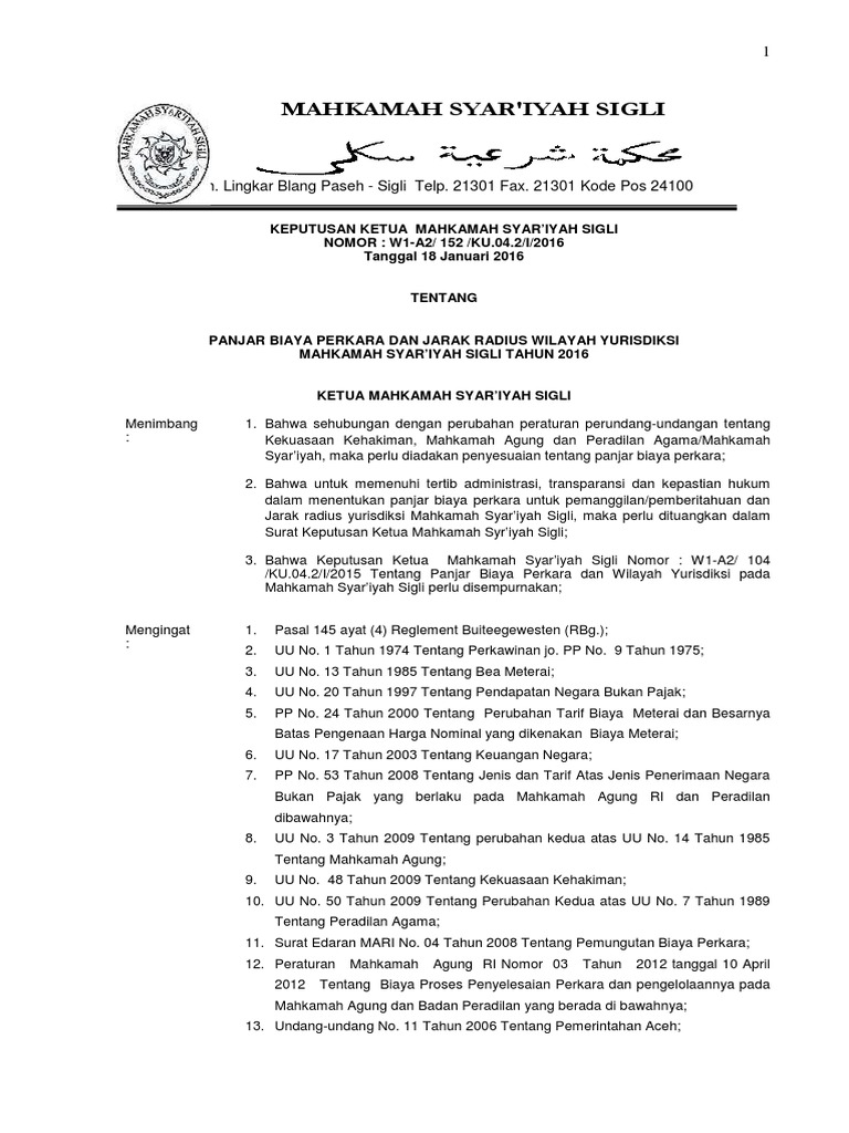 Sk Ketua Ms Sigli Tentang Panjar Biaya Perkara Ms Sigli 2016