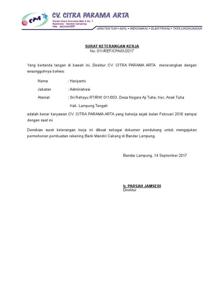 Contoh Surat Keterangan Kerja Untuk Pembuatan Rekening