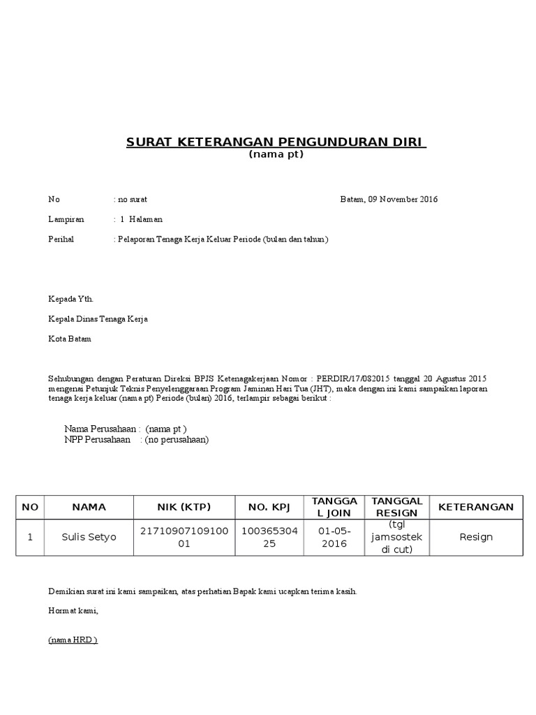 Sampel Surat Pengunduran Diri Resign Kerja Utk Ambil Jht Bpjs