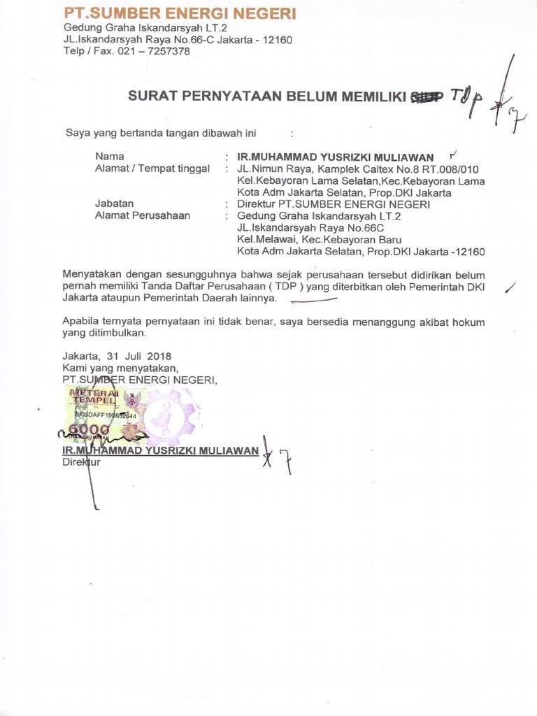 Berikut detail informasi tentang Surat Pernyataan Belum Memiliki Tdp.
