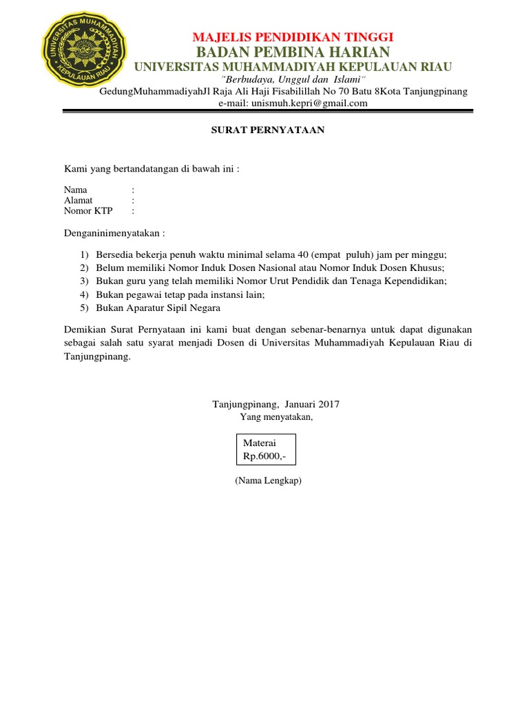 Surat Pernyataan Dosen Tidak Tetapkontrak Sebagai Dosen Tidak Tetap