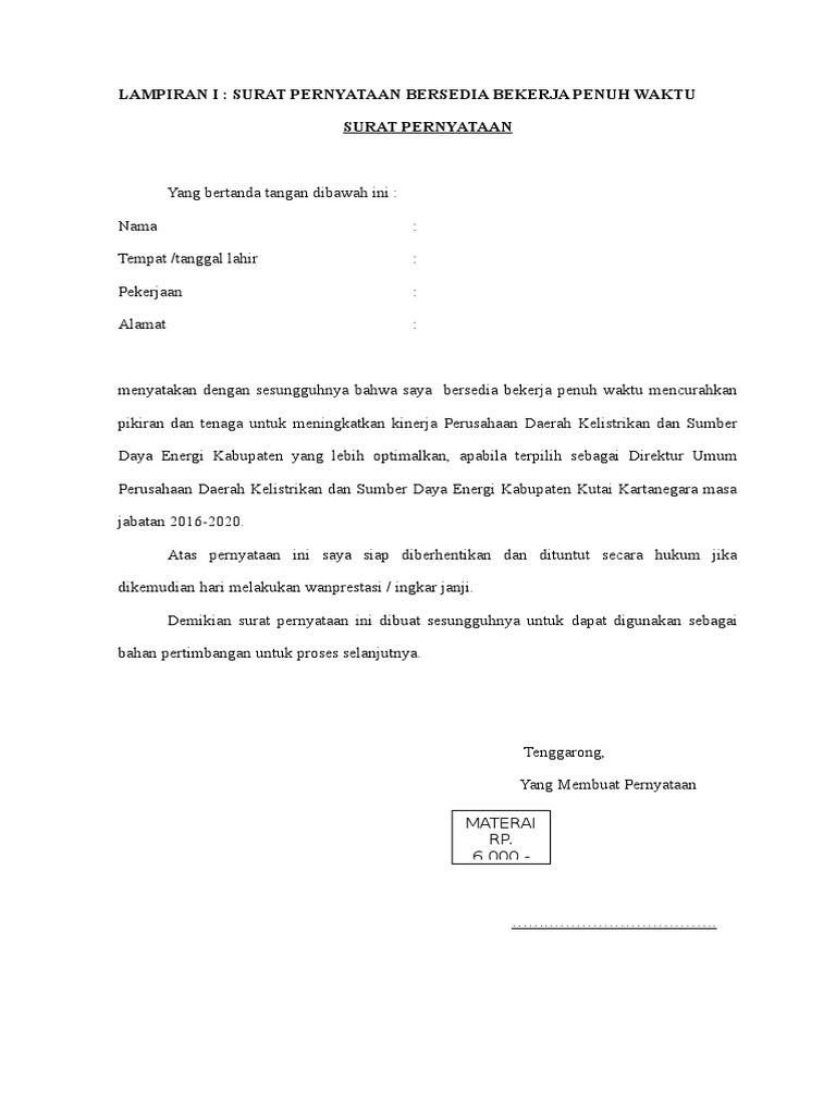 Surat Pernyataan Bersedia Bekerja Penuh Waktu
