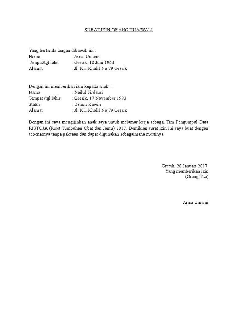 Contoh surat izin orang tua melamar kerja. Surat izin orang tua sering digunakan untuk berbagai keperluan seperti untuk melamar kerja mengikuti kegiatan kegiatan sekolahkampus pembuatan visa hingga digunakan sebagai surat izin menikah. Contoh surat izin orang tua untuk melamar kerja. Sehingga berbagai contoh surat izin orang tua akan anda butuhkan untuk memenuhi persyaratan persyaratan keperluan tersebut.