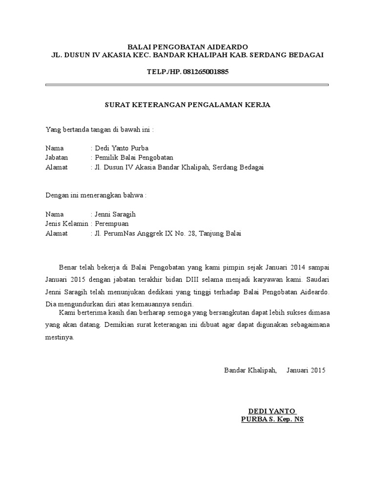 Contoh Surat Keterangan Pengalaman Kerja Di Bidan Praktek Swasta