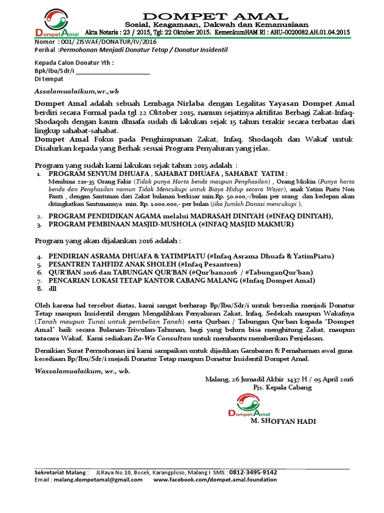 Surat Permohonan Menjadi Donatur Ziswaf