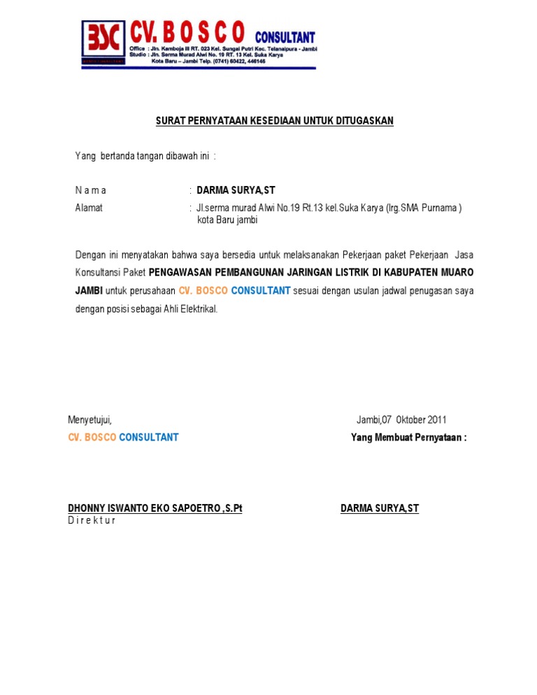Surat Pernyataan Kesediaan Untuk Ditugaskan
