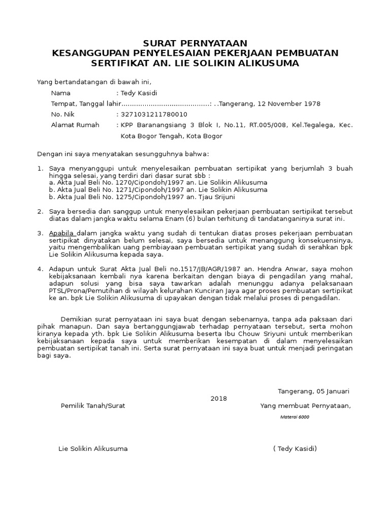 Contoh Surat Pernyataan Kesanggupan Menyelesaikan Pekerjaan