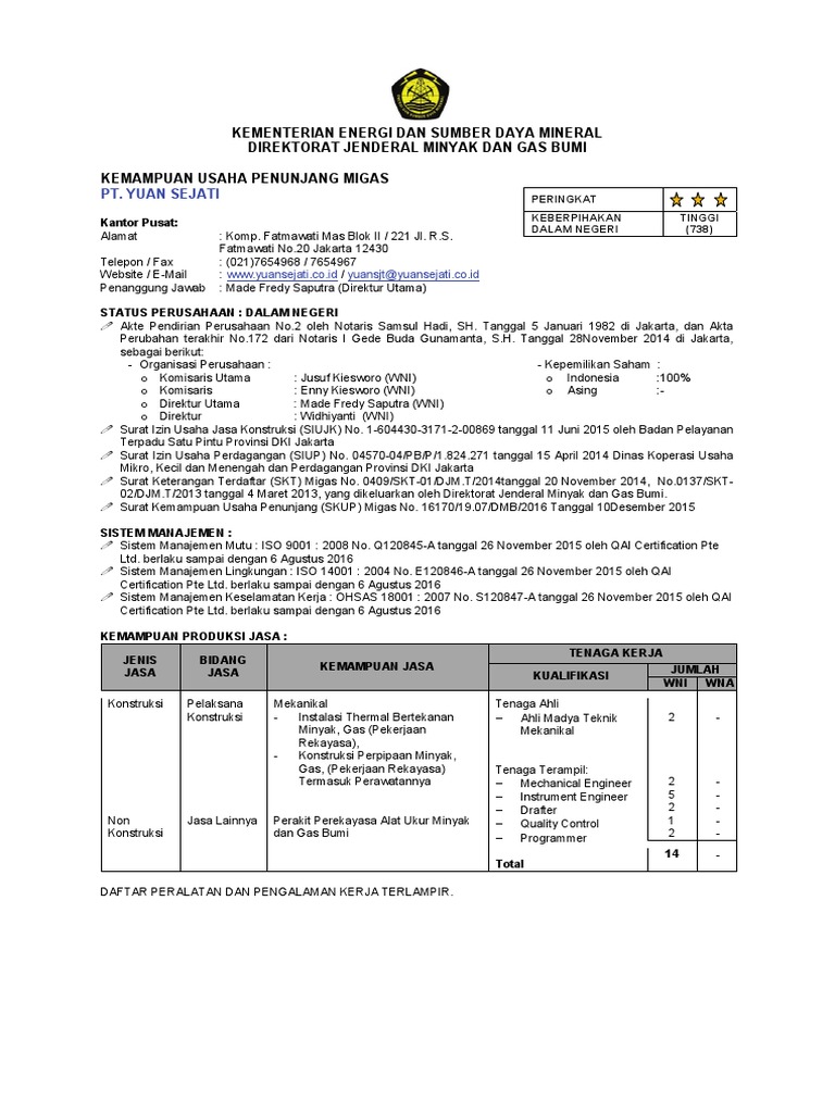 Surat kemampuan usaha penunjang skup migas. Skup migas adalah surat yang diberikan kepada perusahaan dan perseorangan yang memiliki kemampuan memproduksi barang atau jasa dalam negeri berdasarkan hasil penelitian dan penilaian kemampuan nyata yang. Skup migas sering disebut untuk surat kemampuan usaha penunjang migas dan gas bumi. Skup migas skup migas adalah surat kemampuan usaha penunjang migas yang diterbitkan oleh direktorat jenderal minyak dan gas bumi berdasarkan data dan informasi yang tercantum dalam skup migas dan sesuai ketentuan yang berlaku ditjen migas menyusun daftar barang yang dibagi menjadi 3 tiga kategori yaitu.