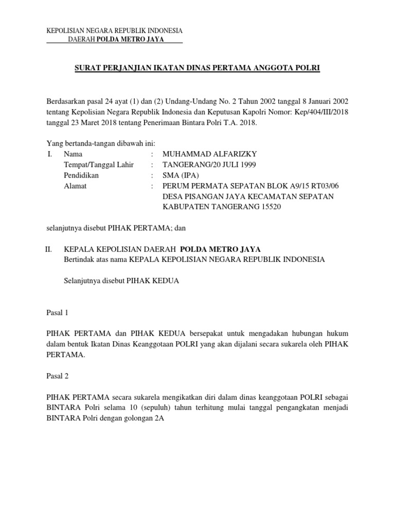Demikian surat pernyatan ini dibuat dengan sesungguhnya dan saya bersedia dituntut dimuka pengadilan serta bersedia menerima segala tindakan yang diambil pemerintah apabila dikemudian hari terbukti pernyataan saya tidak benar. Surat perjanjian ikatan dinas pertama anggota polri berdasarkan pasal 24 ayat 1 dan 2 undang undang no.