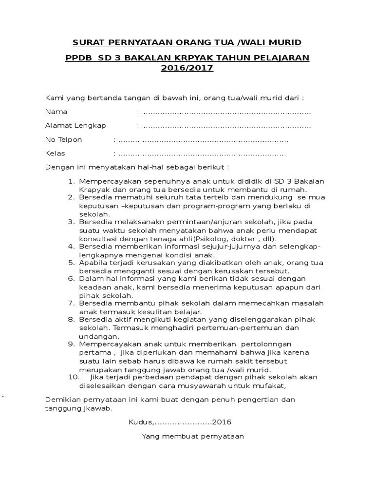 Berikut detail informasi tentang Surat Pernyataan Orang Tua Wali Murid.
